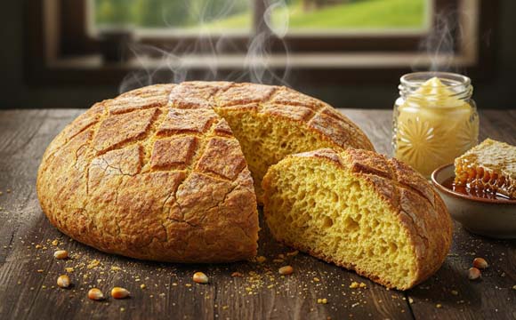 Servis: Fırından çıkan sıcak mısır ekmeğini biraz dinlendirdikten sonra dilimleyerek servis yapın. Özellikle sıcakken, yanında tereyağı, bal, peynir veya Karadeniz yemekleriyle harika gider.