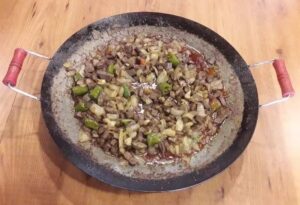 - Daha sonra küp küp doğranmış soğanı ve halka halka doğranmış biberleri de ekleyerek kavurmaya devam edelim.